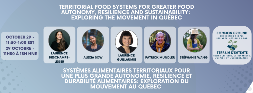 Les systèmes alimentaires territoriaux apparaissent comme une approche visant à régionaliser les systèmes alimentaires tout en privilégiant la gouvernance collaborative. Ils s’inscrivent dans des contextes régionaux, locaux et supra-locaux et impliquent une diversité d’acteurs des systèmes alimentaires et de la société civile. L’un des principaux objectifs des systèmes alimentaires territoriaux est d’améliorer l’autonomie alimentaire locale tout en favorisant une production alimentaire saine et durable. Dans ce webinaire, nous discuterons d’un mouvement social de promotion des systèmes alimentaires territoriaux qui est apparu au Québec, en explorant les avantages et les défis d’une approche axée sur les systèmes alimentaires territoriaux et en présentant quelques exemples de mise en œuvre réussie de ce modèle. Plus précisément, des experts du Réseau Terrains d’entente Canada et des partenaires communautaires discuteront du mouvement et de l’approche des systèmes alimentaires territoriaux au Québec, ainsi que de la manière dont cette approche peut favoriser une plus grande autonomie, résilience et durabilité alimentaires.